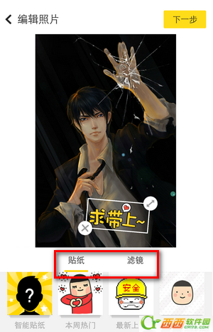 5、加好贴纸和滤镜 选择下一步。就是最重要的添加标签了,点击图片任意位置都可以添加标签(标签有人、地点、心情的选项)