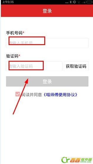 1、下载并安装喵师傅app,在注册界面,输入手机号和验证码点击登录
