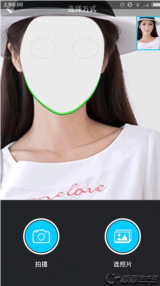 7、把脸放在合适的位置。调整好大小方向。你就能够看到自己穿那件衣服的样子了