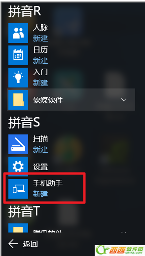 1、在开始-所有应用中,按拼音可以找到手机助手。点击打开。