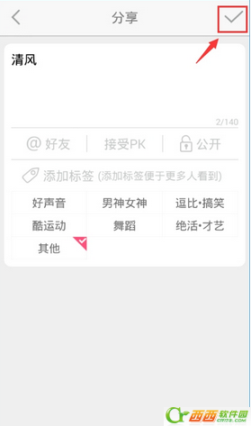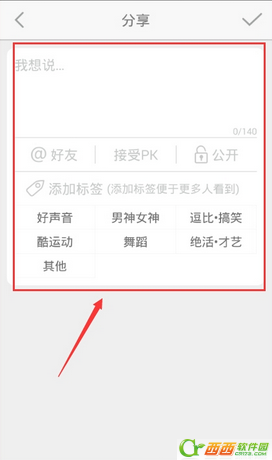 4、再进入分享页面,输入你想说的一些话,同时添加一些标签,在这里还可以@好友,接受PK,以及选择视频是否公开。