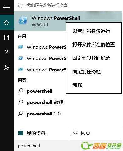 1、点击任务栏的搜索(Cortana小娜)图标,输入Powershell,在搜索结果中右键单击Powershell,选择“以管理员身份运行”。