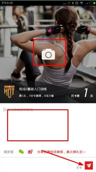 3、在这里跟着视频完成训练后,会出现一个打卡界面,在这里可以拍照,发表心情,再点击下面的打卡就可以的