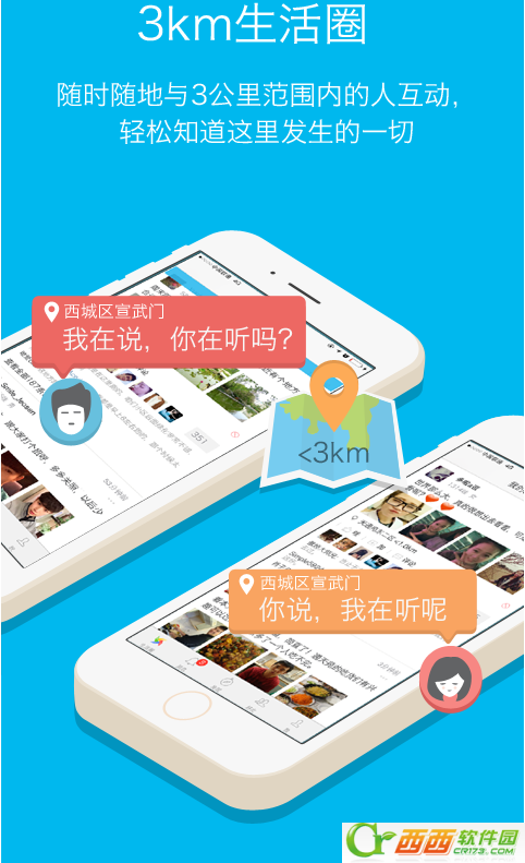 我的3km生活圈:随时随地与3公里范围内的人交流和互动,轻松知道这里发生的一切。3公里定义的不是范围,而是还原了真实生活。