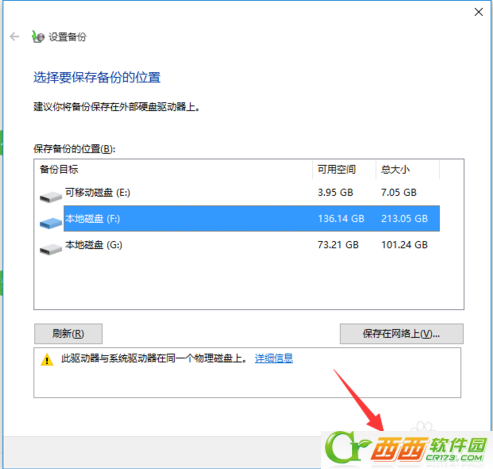5、此时将打开“设置备份”窗口,在此选择“保存备份的位置”,建议将备份文件保存到外部存储设备中。选择要备份文件的磁盘,点击“下一步”按钮。