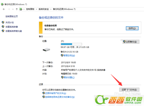 1、在已备份Win10正式版系统的情况下,打开“控制面板”,依次进入“控制面板\系统和安全\备份和还原(Windows 7)”界面中,从此界面可以查看到之前所备份 的文件,从“还原”栏目中点击“还原我的文件”按钮。