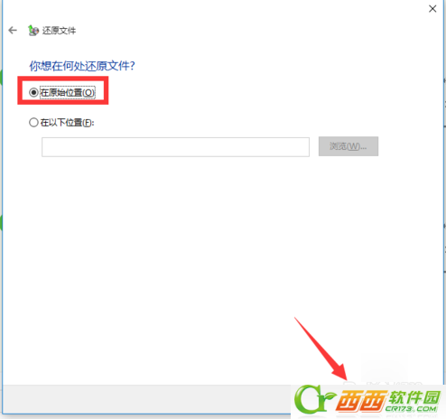 4、接着将提示“在何处还原文件”界面,直接勾选“原始位置”项,点击“还原”按钮,此时将自动进行系统的Win10正式版系统的还原操作。
