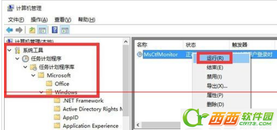 2、从打开的“计算机管理”界面中,依次展开“系统工具”-“任务计划程序”-“任务计划程序库”-“Microsoft”-“Windows”-“TextServicesFramework”菜单项,在窗口的右侧找到“MsCtrMonitor”项,右键点击MsCtrMonitor项,从其右键菜单中选择“进行”项。