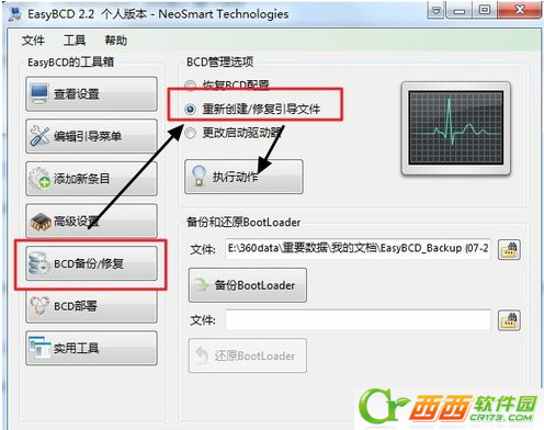 2、运行软件,选择:BCD备份/修复 —— 选择:重新创建/修复引导文件 —— 执行动作