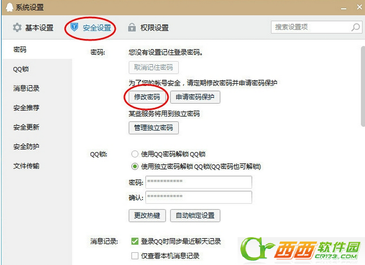 2、进入QQ系统设置界面,选择安全设置---修改密码