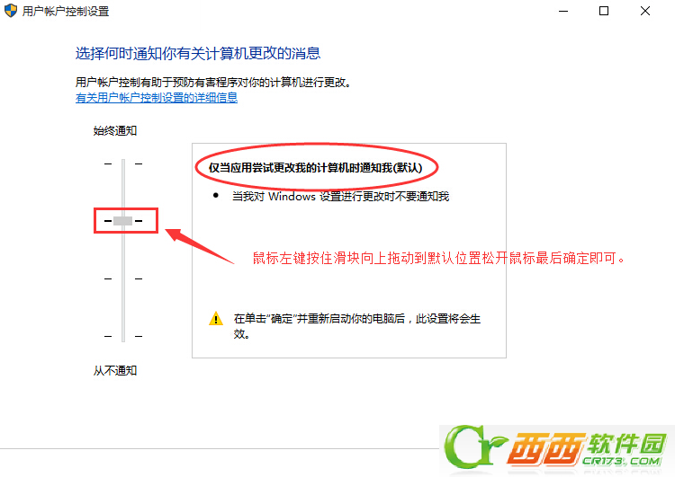 2、在打开的用户帐户控制设置窗口,我们用鼠标左键按住滑块向上拖动;把滑块拖动到默认位置,松开鼠标,再点击:确定