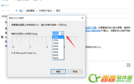 5、这里,选择100%,就代表着正常的缩放级别。所以,改成100%就好了,但要记得点击“确定”,在点击“应用”