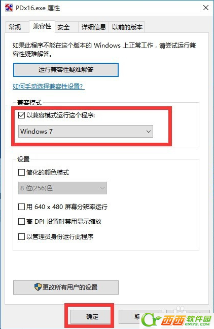 3、从打开的应用程序“属性”窗口中,切换到“兼容性”选项卡,勾选“以兼容模式运行这个程序”项,同时设置相应的运行环境,点击“确定”按钮。