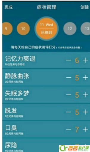 4,症状管理,可以创建自己的症状,并每天自评打分。让自己见证自己一天天的健康恢复。
