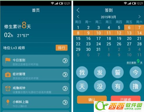 下载并安装戒客app,打开后,你会发现低栏有首页、交流、转移、我的,四个界面,点击今日签到就可以开启软件的计时器功能(它可以统计你的戒撸时间)。每天发誓签到可以获得相应经验值及连签天数(但是如果在12点前没有及时签到,计时器将会归零,无法弥补)。