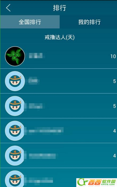 点击“排行”中,全国排行可以看到签到的连签天数在全国的排名,而在我的排名中是按照经验值排名以及会员升级说明。