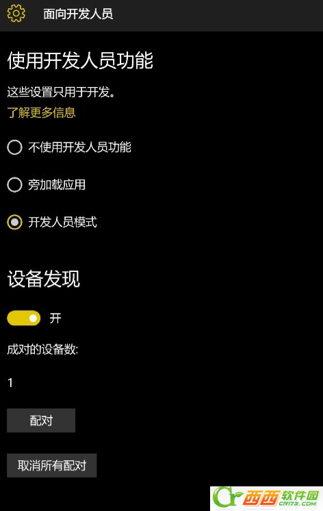 3. 打开wp10手机, 设置--更新和安全--面向开发人员 : 勾选开发人员模式 ,打开设备发现