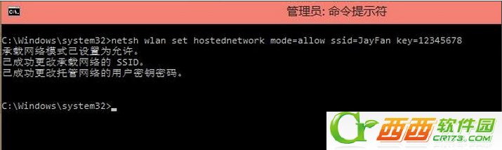 2、在命令提示符输入:netsh wlan set hostednetwork mode=allow ssid=JayFan key=12345678,回车执行命令。(当然,你可以直接复制命令,然后Ctrl+V粘贴到win10命令提示符中,因为win10支持命令提示符的Ctrl+v操作啦)。