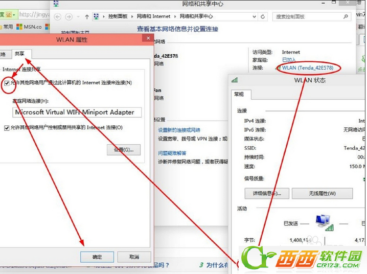 4、网络和共享中心,找到已正常连接Internet的网络,点击它,在属性中,选择“共享”,勾选其中的“允许其他网络用户通过此计算机的Internet连接来连接”。并且家庭网络连接选择虚拟wifi“Microsoft Virtual WIFI Miniport Adapter ”,单机“确定”。