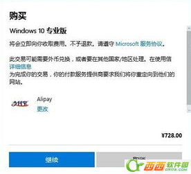 7、购买更专业版Win10升级,现在也是支持支付宝。点击【继续】这样就会提示支付宝二维码支付的界面。支付成功就会购买成功。