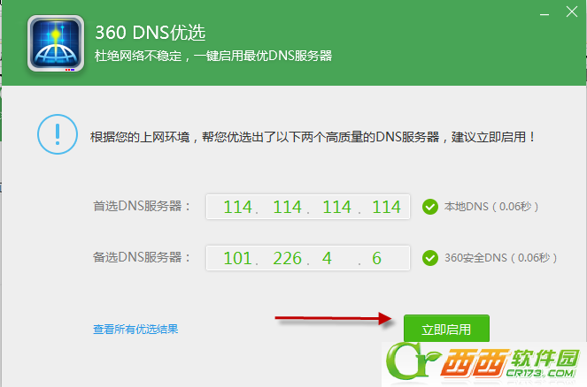 4、在“360 DNS优选”界面中,将自动给出最佳“首选DNS”和“备用DNS”,在此直接点击“立即启用”按钮。