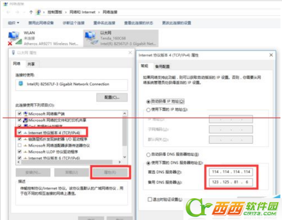 4、从打开的“本地连接 属性”窗口中,选中“Internet协议(TCP/IP V4)”,点击“属性”按钮,并在弹出的“属性”窗口中手动设置DNS地址,点击“确定”完成设置。