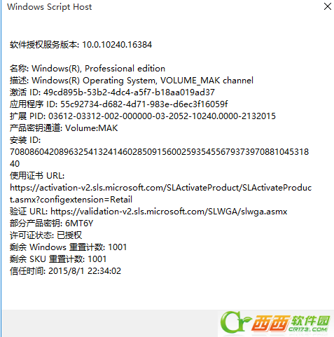 可以查询到Win10的激活信息,包括:激活ID、安装ID、激活截止日期等信息。看不懂的继续往下。