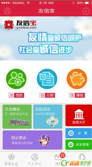 友信宝是一款互联网社交金融类的手机应用。这款应用为用户提供好友之间借还钱资金往来的安全CA电子借据、好友之间聚会资金往来平台、个人投资理财的安全平台、大学生、白领信用购物的安全平台。