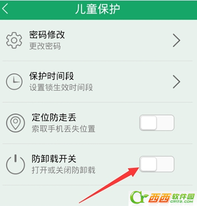 1、开启“眼萌”,进入“儿童保护”,点击“防卸载开关”按钮