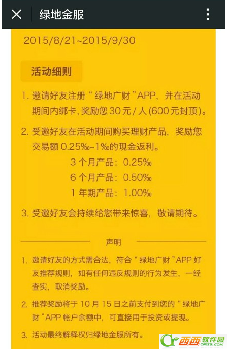 本次绿地广财APP下载注册送30元现金可提现的活动有效时间为2015年8月21号—9月30号止.估计很有可能会提前结束.