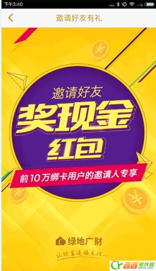 1、邀请好友注册绿地广财app,好友在活动期间绑卡,且好友属于钱10万名绑卡用户,奖励30元/人(600元封顶)