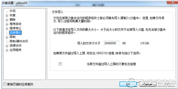 a) 在沙盘pkbox01上鼠标右键,选择“沙盘设置”,在“导入的文件不大于”处填写20480000。可以填大一些,不过此处似乎沙盘存在一些bug。