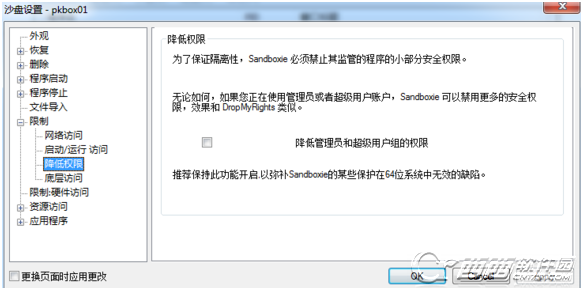 b) 点击Apply按钮保存,然后打开“限制”,选择“降低权限”,将“降低管理员和超级用户组的权限”前面的勾去掉: