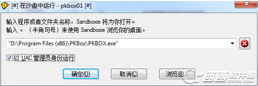 5. 接下来就可以开始使用沙盘多开pkbox了。在沙盘pkbox01上鼠标右键,选择“在沙盘中运行”à“运行任意程序”,弹出对话框,选择pkbox的安装路径下的PKBOX.exe,并勾上“以UAC管理员身份运行”: