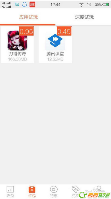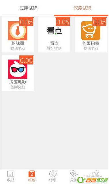 2、进入页面,可以看到“收益余额”一栏显示为5.00元,接着你可以点击红包,可以看到几个下载的选项以及其对应的收益,另外不卸载的话隔天使用还有深度收益。