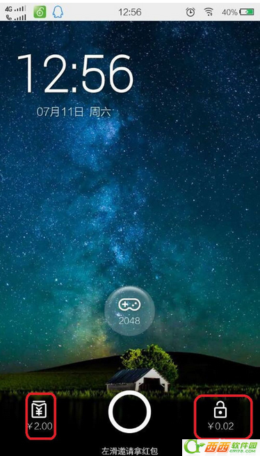 3、试着锁屏,如图所示,左边是邀请收益,右边则是划屏收益,有时还会出现分享收益(中间的是2048游戏,玩到高分再分享还有可能获奖哦)