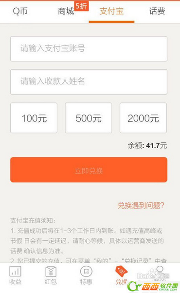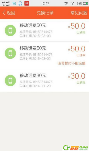 4、当你的收益积累足够时就可以兑换了,如图,你可以根据自己的余额和金额选择兑换Q币、实物、话费、支付宝提现......(PS:兑换是真的,附加一张我的兑换记录)