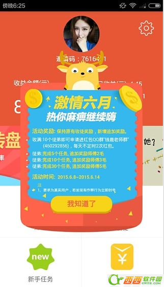 4邀请好友,即送红包并建立师徒关系,能立即得到6元注册奖励,您也能享受该徒弟和你