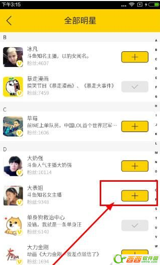 2、出现的全部明星中,点击加号按钮就关注成功啦,如下图,网侠小编关注一下大表姐,就点击大表姐旁边的那个按钮。