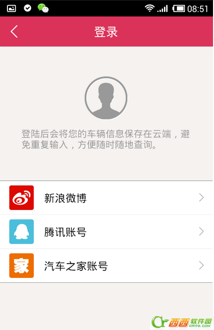 3、点击列表顶部的【登录】命令,在下方显示的腾讯、新浪、汽车之家任选一个账号,即可登录成功。