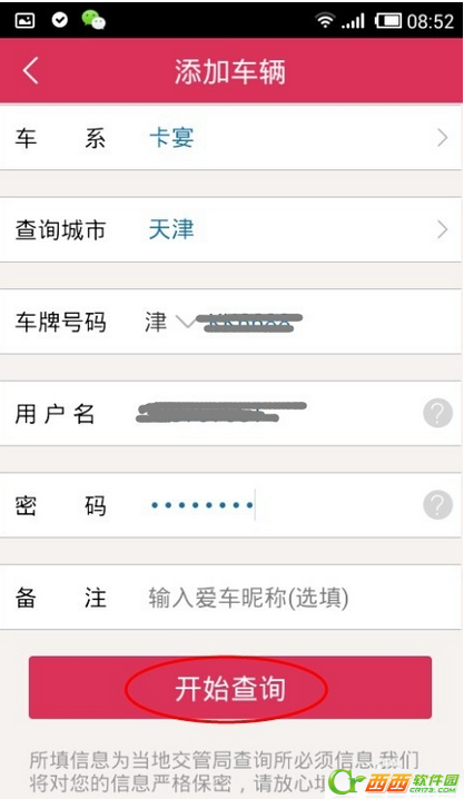 6、填写详细的车辆信息及用户名和密码(刚才选择的授权账号),然后点击开始查询按钮。