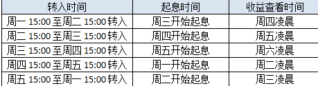 注意:根据以上表格,客户在不同时间转入的资金,起息时间可能会有所不同,客户当日能取得的总收益会按客户已确认起息的总份额进行计算,而对于客户新转入未达到起息时间的资金不会享受收益。此外,遇到节假日起息时间将会顺延。