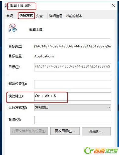 5、想通过快捷键启动的朋友可以进行如下设定。右键点击“截图工具”快捷方式图标,选择“属性”,在弹出的窗口中“快捷方式”栏目下有“快捷键”一项,直接按键盘上的字母键,即可形成快捷键,如直接按“s”,会自动形成“ctrl+alt+s”的快捷键(必须为英文状态输入)。下次使用时,可以直接通过“ctrl+alt+s”的组合键启用截图工具。