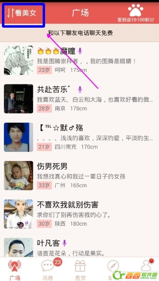 2、进入到首页,也就是“广场”,在这里可以看到许多用户,可以根据左上角的“看帅哥”/“看美女”自己搜索