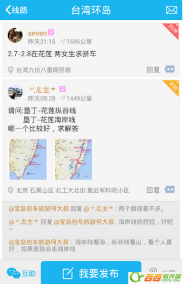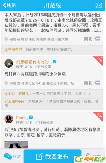 2、选择一条线路,会看到很多约伴信息,还有捡人、搭车、求助、路况等实用信息,寻找合适自己的小伙伴聊天交流。