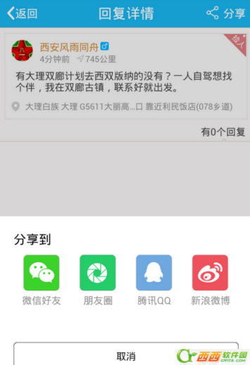 3、如果看到一条消息想要分享给更多的人看到,点进信息后选择分享到微博微信朋友圈都可以;如果遇到时间差不多的驴友后想进一步沟通,可以点击信息下方的对聊,有的驴友需求紧迫的还会留下电话以方便沟通,也可点击他的头像,发消息就是私聊,TA的发布里能看到他所有发布的内容。点击线路字样右边的信封能够看到自己与其他驴友的评论以及私聊情况。