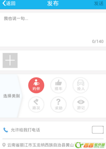 4、点击我要发布即可发布信息,在约伴、搭车、捡人、求助、路况、游记中选择类别,还可以选择是否留下联系电话,地址也可以手动更改。