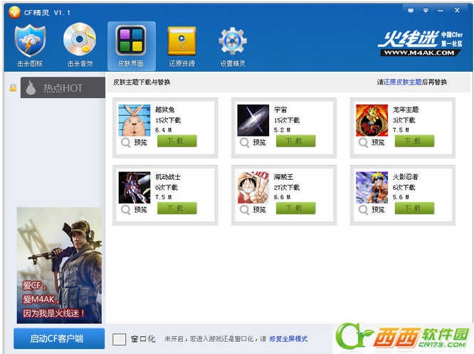 CF精灵是一款免费的专业cf窗口化工具,软件并非外挂程序,保证不会封号。主要能够实现cf完美窗口化,cf多开,击杀图标下载,击杀音效下载,皮肤界面替换,资源还原等实用功能。利用CF精灵,玩家可以打造自己专属的击杀图标和音效,并实现cf多开窗口化操作,是穿越火线玩家必备的游戏辅助软件。