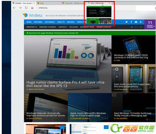 Windows10Edge浏览器的标签页预览功能。即鼠标指针在标签页上停留时,会出现该标签页的小窗口预览。在Win10预览版10558中,这一功能已经默认开启。