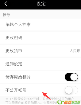 2、在设置中,我们可以看到下方有不公开账号选项,点击后,只有经过你认可的用户才能够看见你的相片和影片。